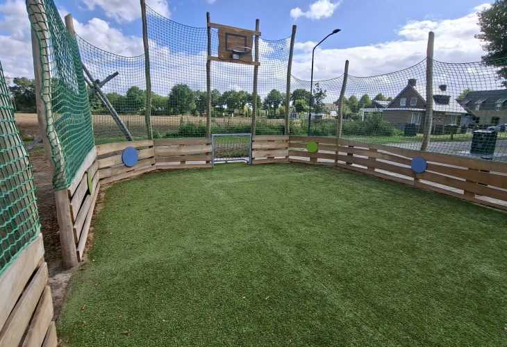 Nadat de natuurlijke, inclusieve speeltuin is gerealiseerd, was er nog een grote wens voor een voetbalveld voor de grotere jeugd van het dorp. Samen met vrijwilligers zijn de schouders onder dit initiatief gezet met een multifunctioneel speelveld als resultaat!